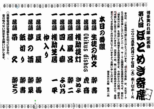 博多笑われ隊の第8回目の公演を開催いたしました。当日は、酔書が見台と膝隠しを忘れてくるし、酔泉さんもめくり一式をお忘れになるし、、おまけに記録用のビデオカメラも、記録写真用のカメラも忘れてきて、あるのは集合写真のみ。そういう意味で、皆さんのそれぞれの記憶の中に残った?発表会でした。